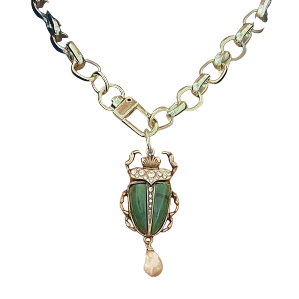 This necklace features a vintage-inspired beetle pendant crafted with intricate detailing that highlights its antique charm. The pendant is suspended from a delicate 17-inch gold chain link, exuding timeless elegance. The gold-tone finish enhances the warm, classic appeal of the design, making it a versatile accessory for both casual and formal occasions. The beetle pendant may include subtle textures or accents to capture its vintage character, such as engraved patterns, enamel, or small gemstone embellishments. This necklace is a striking piece, ideal for those who appreciate unique, nature-inspired jewelry.