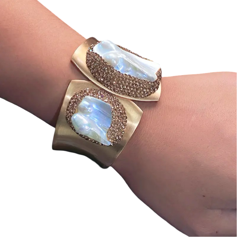 A baroque-inspired gold geometric cuff adorned with lustrous pearls seamlessly blends the opulence of the Baroque era with contemporary elegance. Its intricate geometric patterns, reminiscent of Baroque architecture, are intricately crafted in radiant gold, forming a striking contrast against the creamy pearls, evoking a sense of timeless beauty and sophistication.