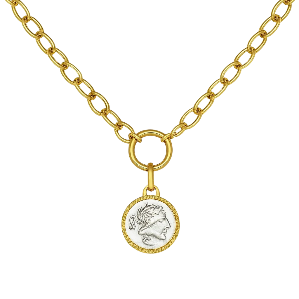 Embrace timeless elegance with this gold-tone chain necklace, featuring twisted oval links and a bold medallion pendant engraved with a classical Greco-Roman profile. The antique coin design adds vintage sophistication, while the chunky link style gives it a modern, fashion-forward edge—perfect for pairing with plunging necklines or layered with minimalist chains.