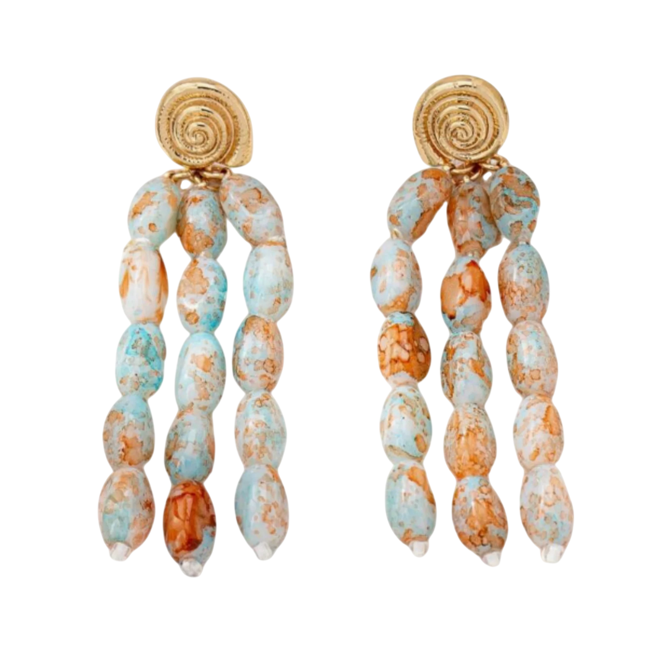 Elevate your elegance with these stunning drop earrings, featuring a trio of beaded strands in soft peach and aqua tones anchored by a textured gold spiral stud. The graceful dangle and earthy color palette make them a perfect blend of boho charm and modern sophistication—ideal for sunset soirées, beach weddings, or effortlessly chic everyday looks.