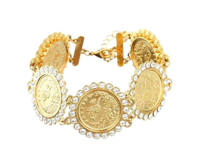This bracelet showcases a luxurious and ornate design inspired by traditional coin jewelry. It features multiple gold-toned medallions engraved with intricate Ottoman-style motifs. Each coin is framed with a halo of sparkling clear rhinestones, enhancing the piece’s regal appearance. The bracelet is connected with delicate gold links and includes an adjustable clasp for a secure fit. It’s a statement accessory ideal for formal or culturally themed ensembles.