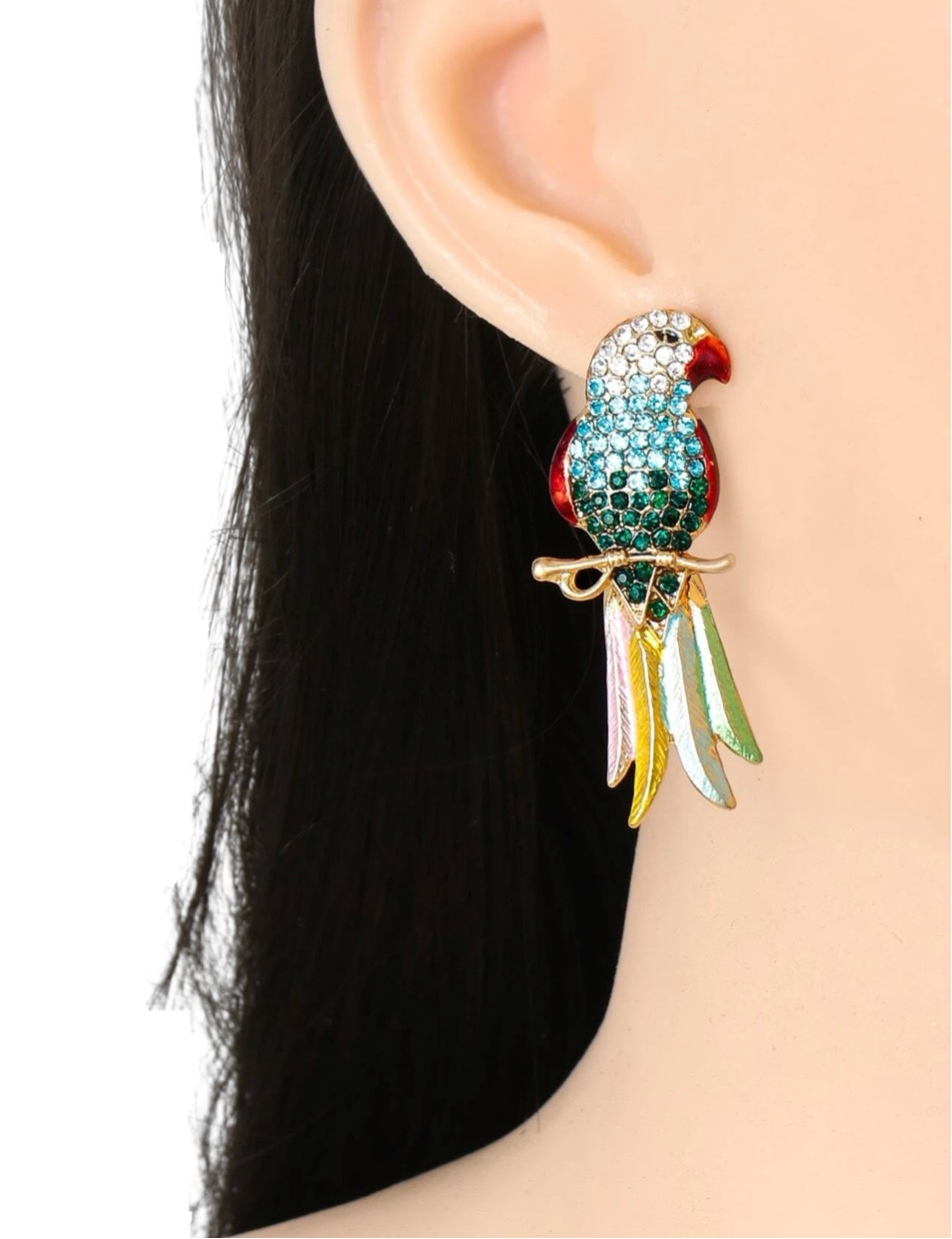 Make a vibrant statement with these multi-colored crystal parrot earrings, exuding tropical allure and playful charm. Each earring features a colorful array of crystals, meticulously arranged to form the captivating silhouette of a parrot in flight. From vivid blues to radiant yellows and lush greens, the kaleidoscope of hues adds a burst of energy and whimsy to any ensemble. These eye-catching earrings are the perfect accessory for those who aren’t afraid to embrace bold and joyful style, instantly elevating any look with their exuberant charm and magnetic presence.