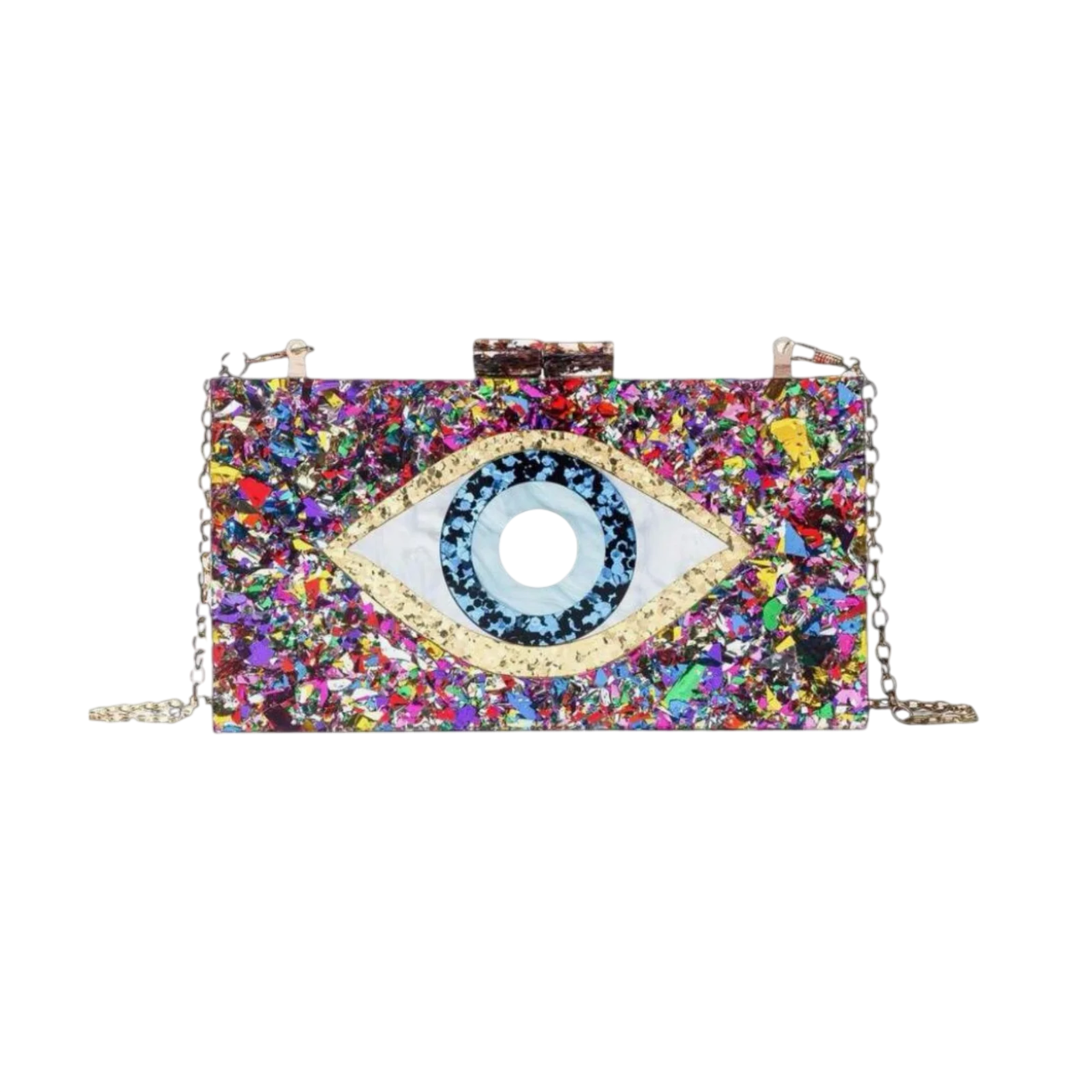 This trendy acrylic clutch doubles as a stylish purse with its detachable gold chain strap. The sleek rectangular design features a striking spiritual evil eye motif, meticulously crafted in vibrant colorful accents, symbolizing protection and good fortune. The clutch’s glossy finish enhances its modern aesthetic, while its compact yet spacious interior is perfect for essentials like your phone, keys, and makeup. Whether you’re heading to a chic soirée or a casual outing, this clutch exudes fashion and a touch of mystical charm, making it the perfect accessory to elevate any look.