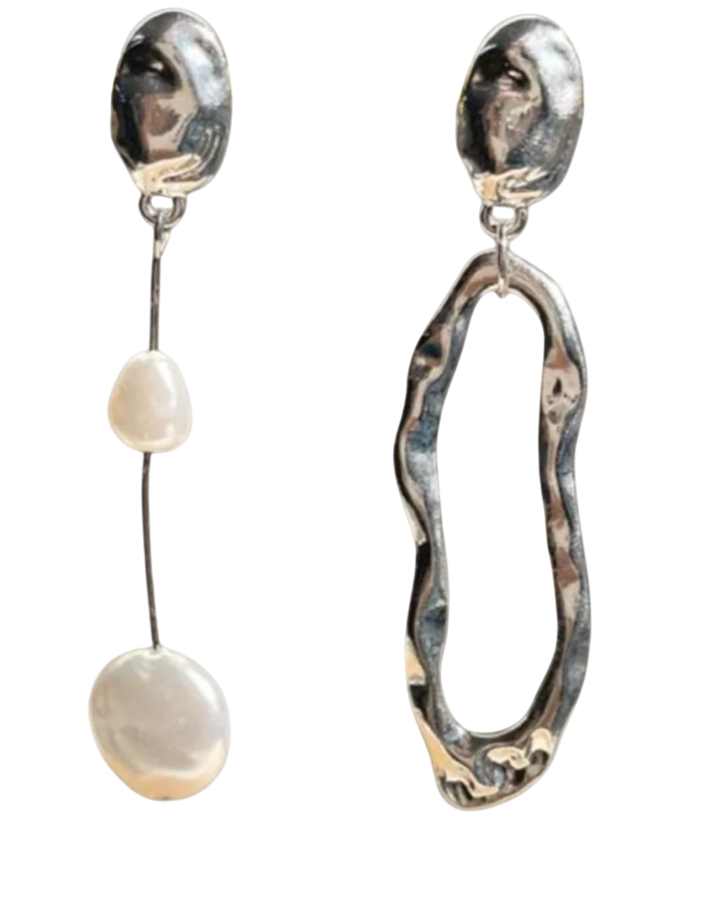Geometric pearl Mismatched earrings-silver ALSO This unique mismatched geometric earring in silver with pearl detail is a stunning combination of contemporary design and timeless elegance. The silver geometric shape, with its clean lines and modern aesthetic, creates a bold and eye-catching contrast against the delicate and iridescent pearl nestled within. This intriguing fusion of contrasting elements adds a touch of sophistication and individuality to any outfit, making it a true statement piece for those who appreciate both the avant-garde and the classic.
