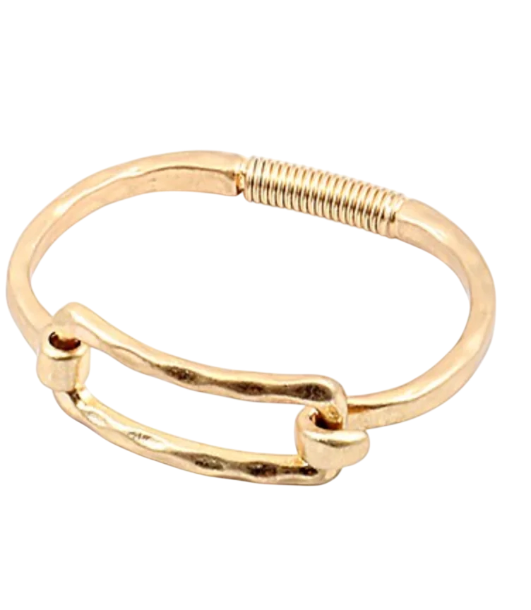 Imagine a modern and sleek rectangular bangle crafted from stainless steel, boasting a minimalist geometric design that exudes contemporary elegance. The bangle’s streamlined aesthetic is enhanced by a practical spring closure, ensuring easy and secure opening and closing. This accessory seamlessly merges functionality with style, making it a sophisticated and versatile addition to any modern wardrobe.