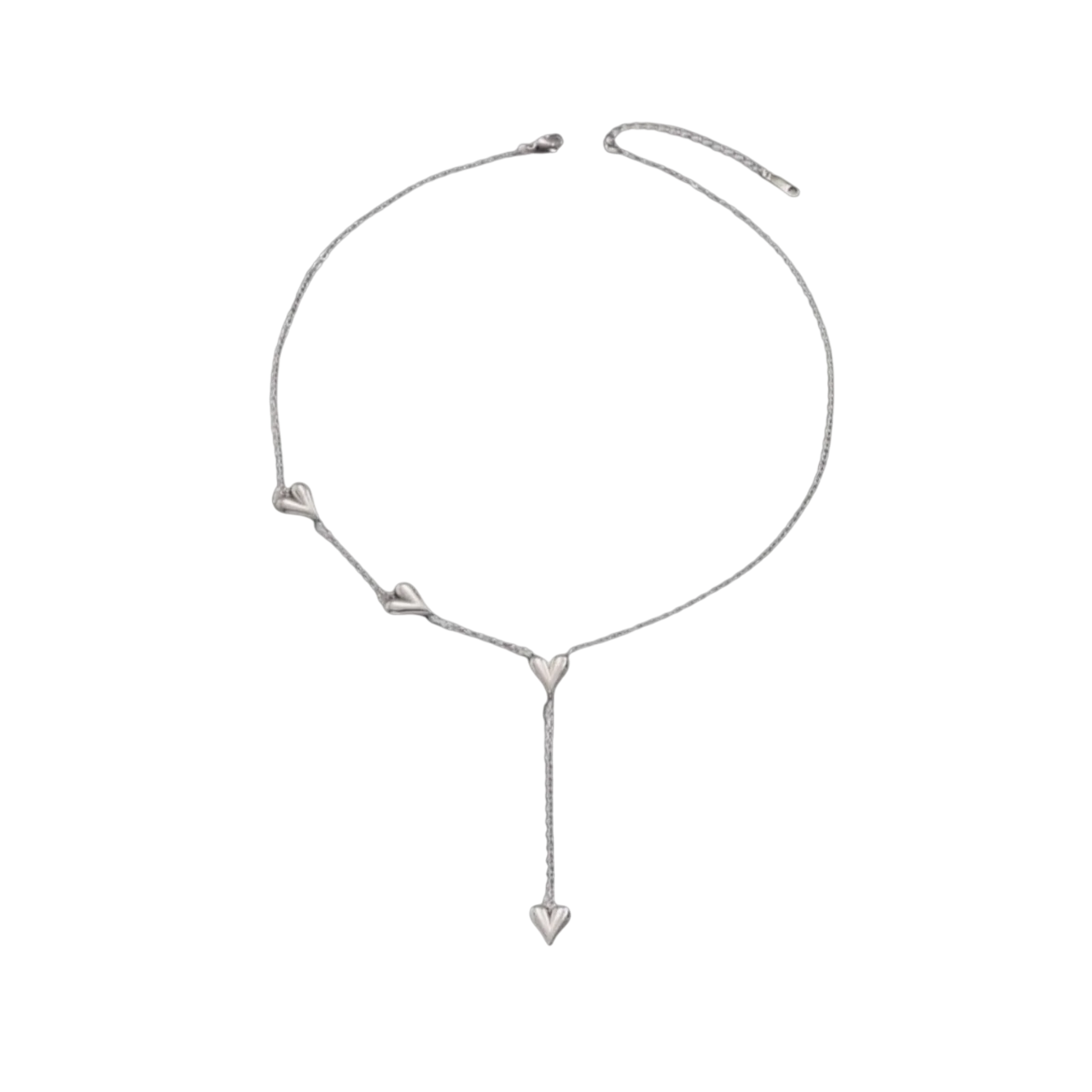 A delicate gold chain necklace featuring small, evenly spaced heart-shaped charms. Each charm is polished to a smooth, shiny finish, creating a subtle sparkle as it catches the light. The chain is fine and lightweight, offering a minimalistic yet elegant look. Perfect for layering or wearing alone, this piece exudes a feminine and timeless charm, suitable for casual or formal occasions.