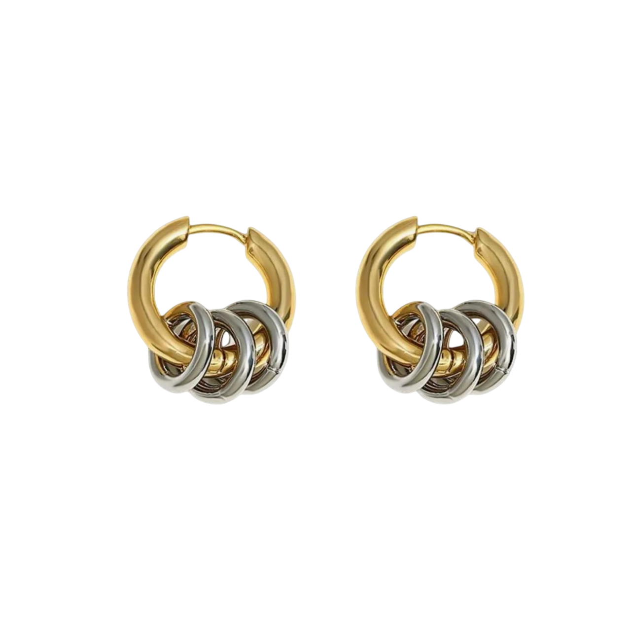“A modern twist on a timeless accessory, these small gold hoop earrings feature three round gunmetal links, creating a stunning two-tone design. The blend of warm gold and edgy gunmetal offers a bold yet versatile statement, effortlessly complementing both casual and formal looks. Perfect for adding a trending vibe to a classic aesthetic, these earrings are a must-have addition to any jewelry collection.