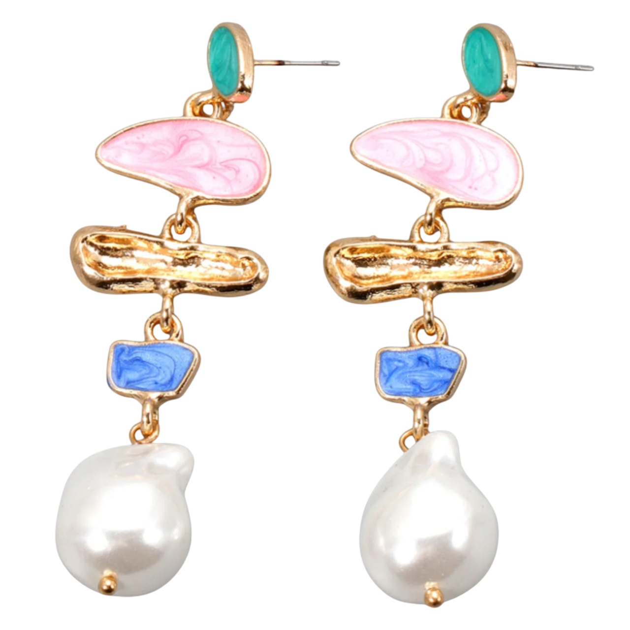 Step into playful elegance with these artistic drop earrings, featuring a vibrant blend of enamel accents in green, pink, and blue, layered with textured gold bars and finished with bold baroque-style pearls. Their abstract, sculptural design makes them a standout accessory—perfect for creative styling, gallery nights, or adding a pop of personality to your everyday look.