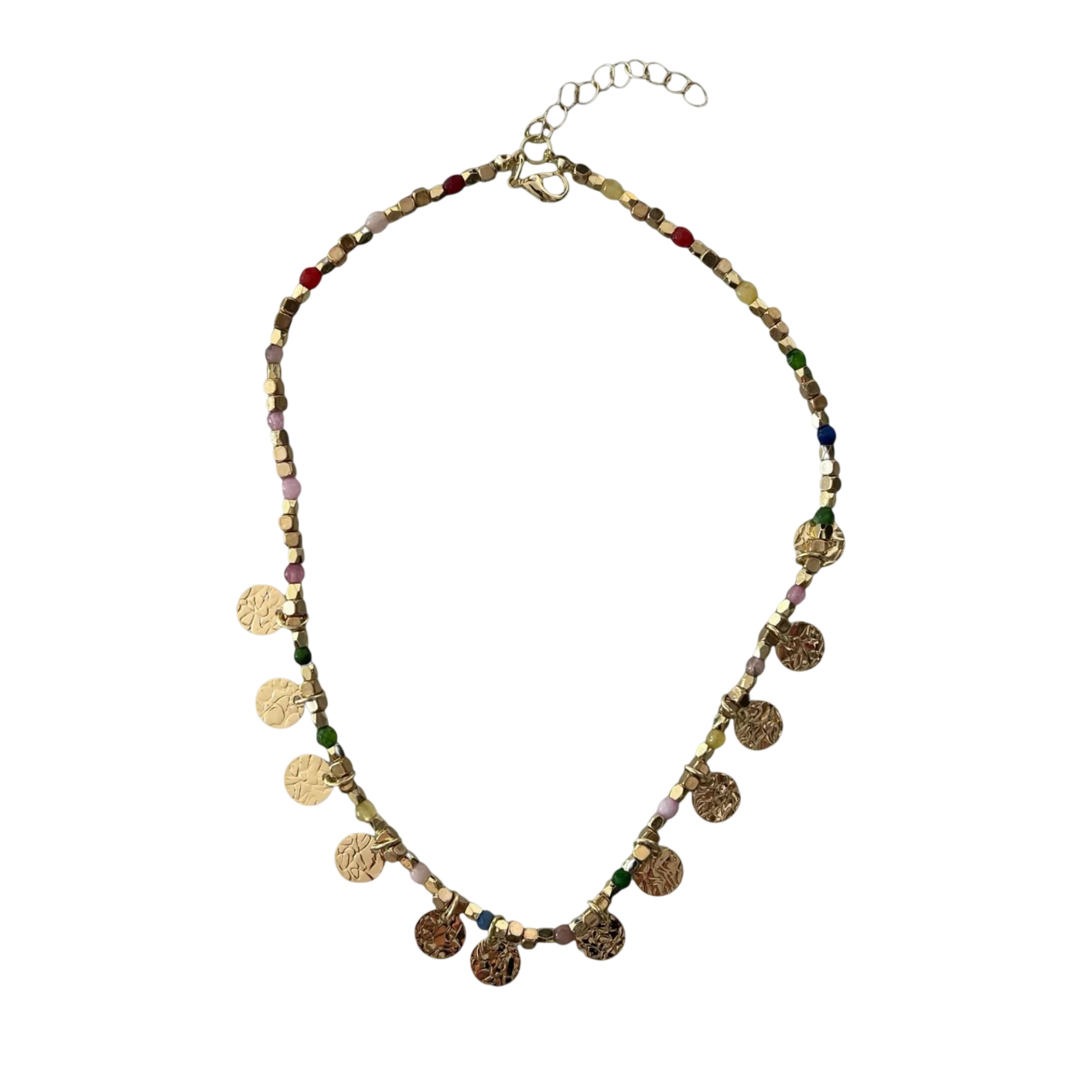 Add a pop of playful charm to your look with this handmade beaded necklace, featuring an artful mix of colorful beads and shimmering gold disc accents. Designed for effortless layering, this boho-chic piece brings just the right touch of sparkle and personality to your everyday style. Measuring 15 inches with a 3-inch extender, it sits perfectly at the collarbone—ideal for stacking with longer chains or wearing solo for a subtle statement. Whether you’re headed to a festival, brunch, or just chasing good vibes, this necklace is your new go-to.