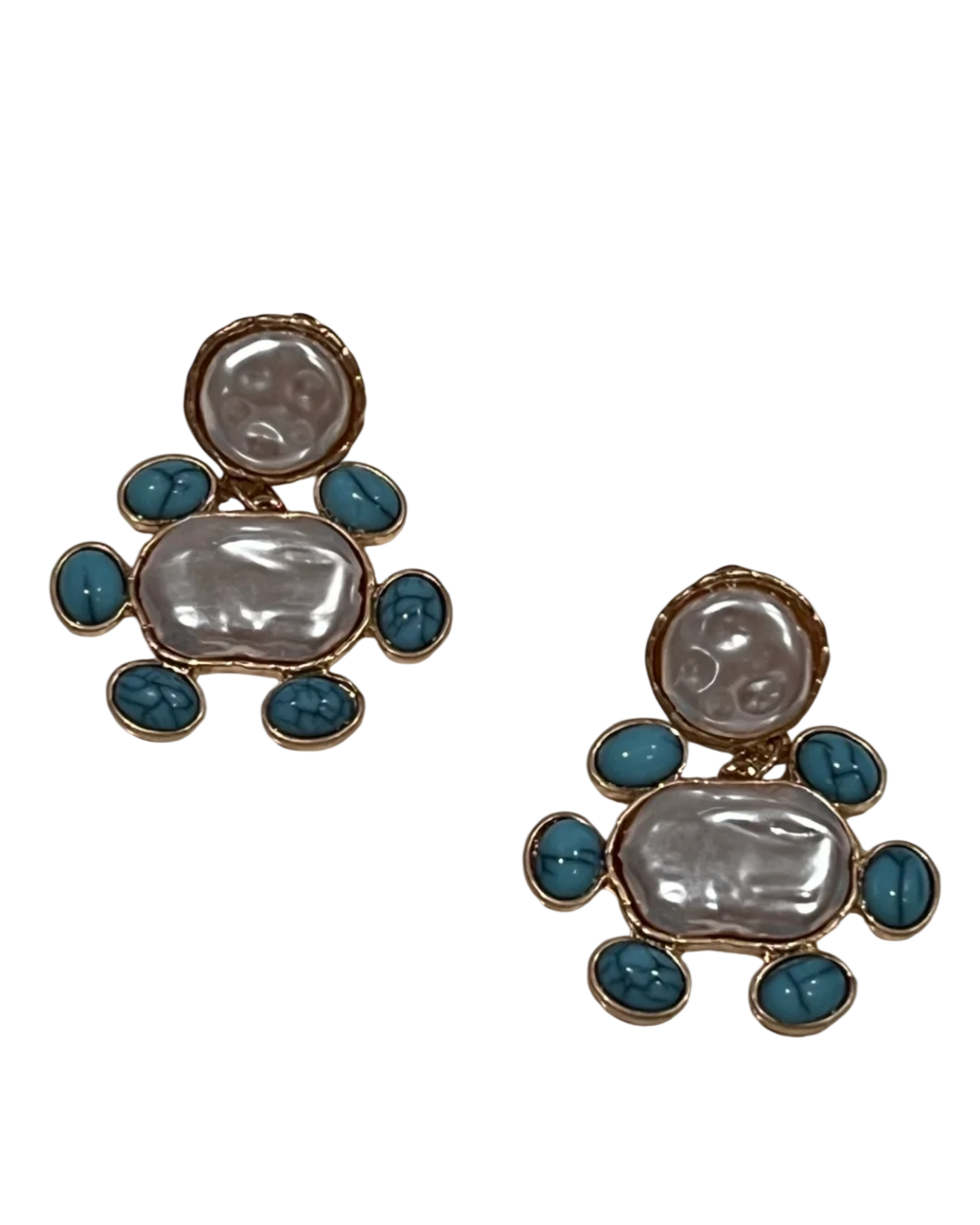 Not your typical Stud Earrings. These oversized Mediterranean Inspired Pearl and Turquoise Earrings have all the Vibes and color of the Islands. From Beach to Bridal, these earrings will take you many places.