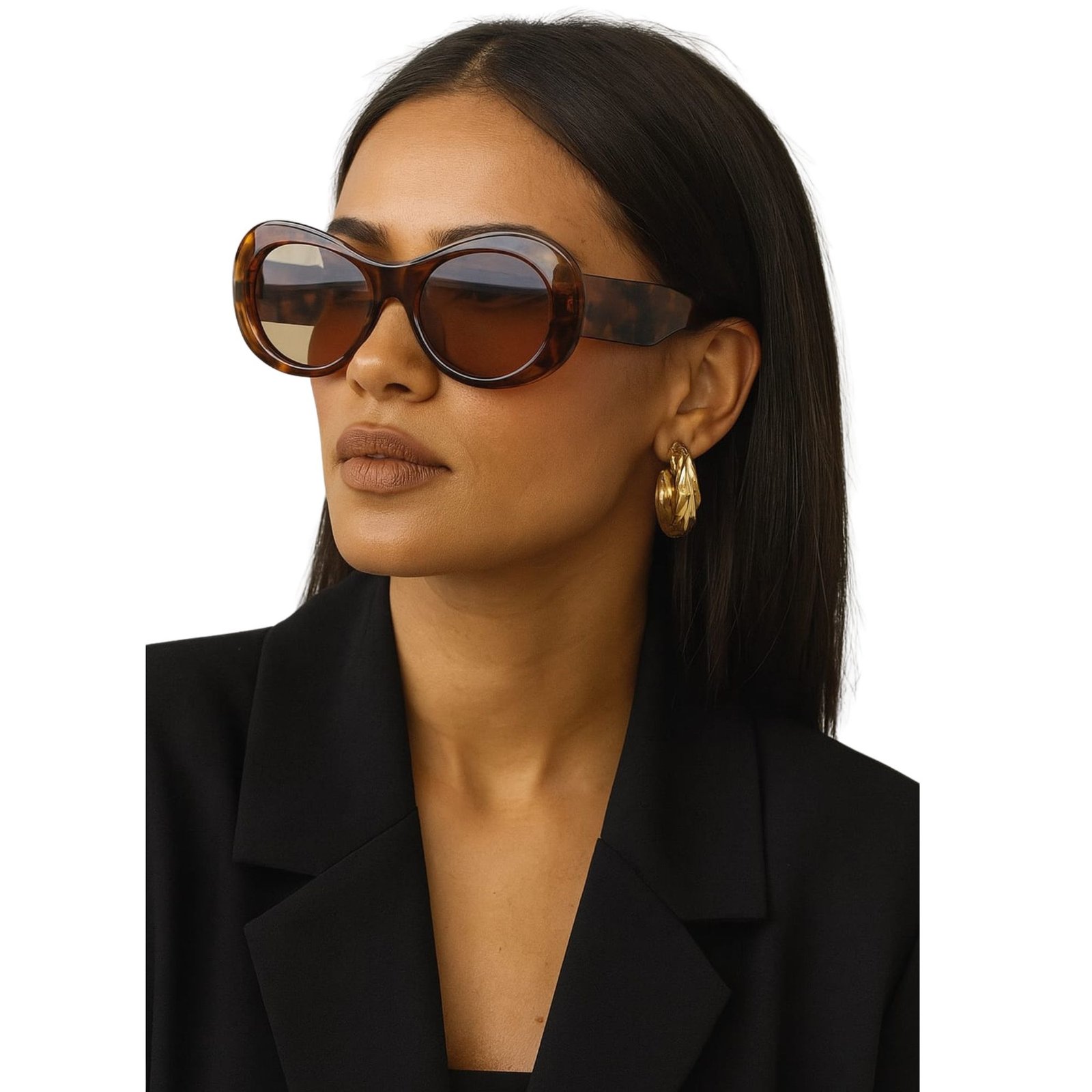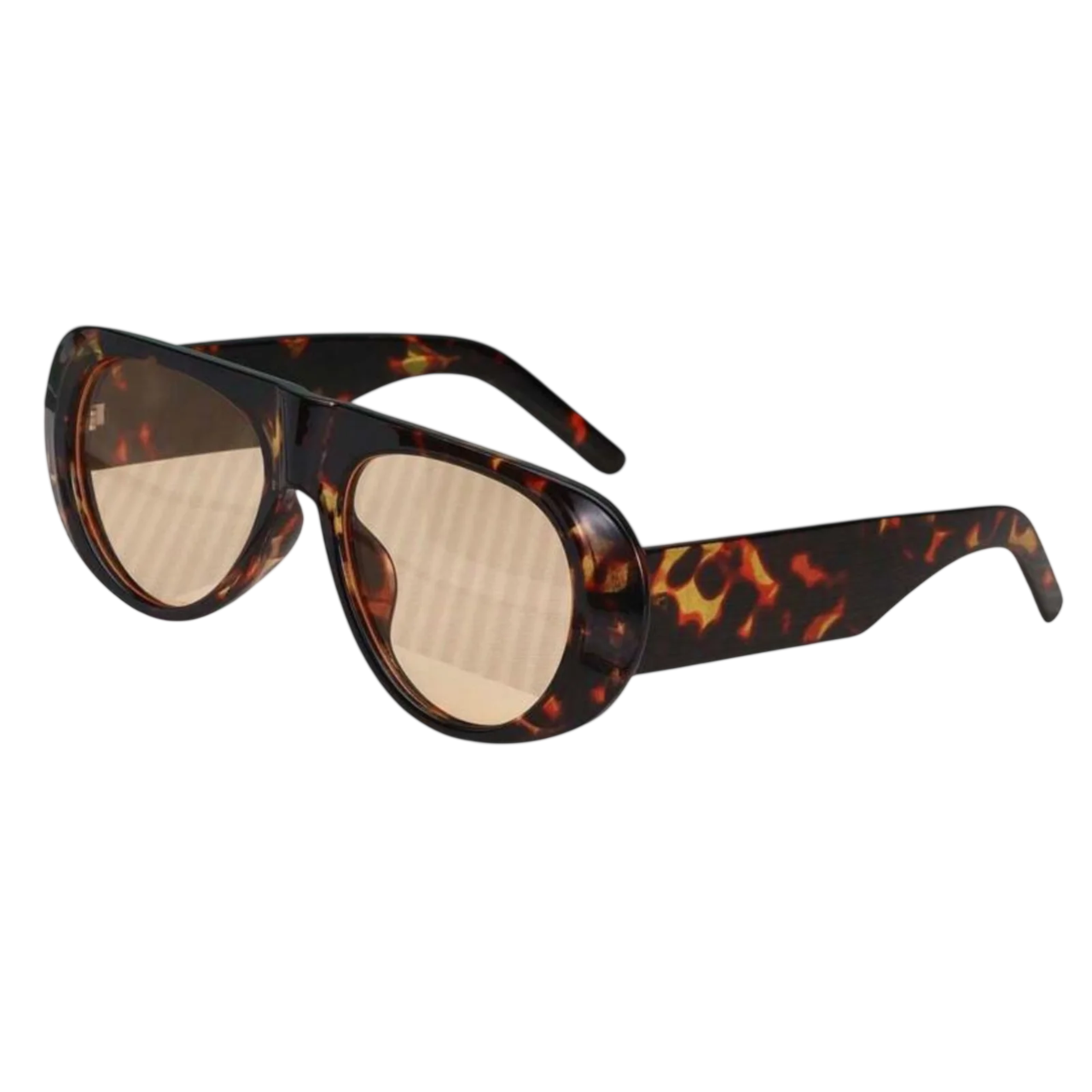 These tortoiseshell sunglasses blend retro charm with a contemporary twist. Featuring a bold, rounded frame with a rich mottled brown and amber pattern, they’re complemented by lightly tinted beige lenses that offer both style and sun protection. The wide temples enhance the statement look, making them a fashionable choice for everyday wear or standout accessorizing.