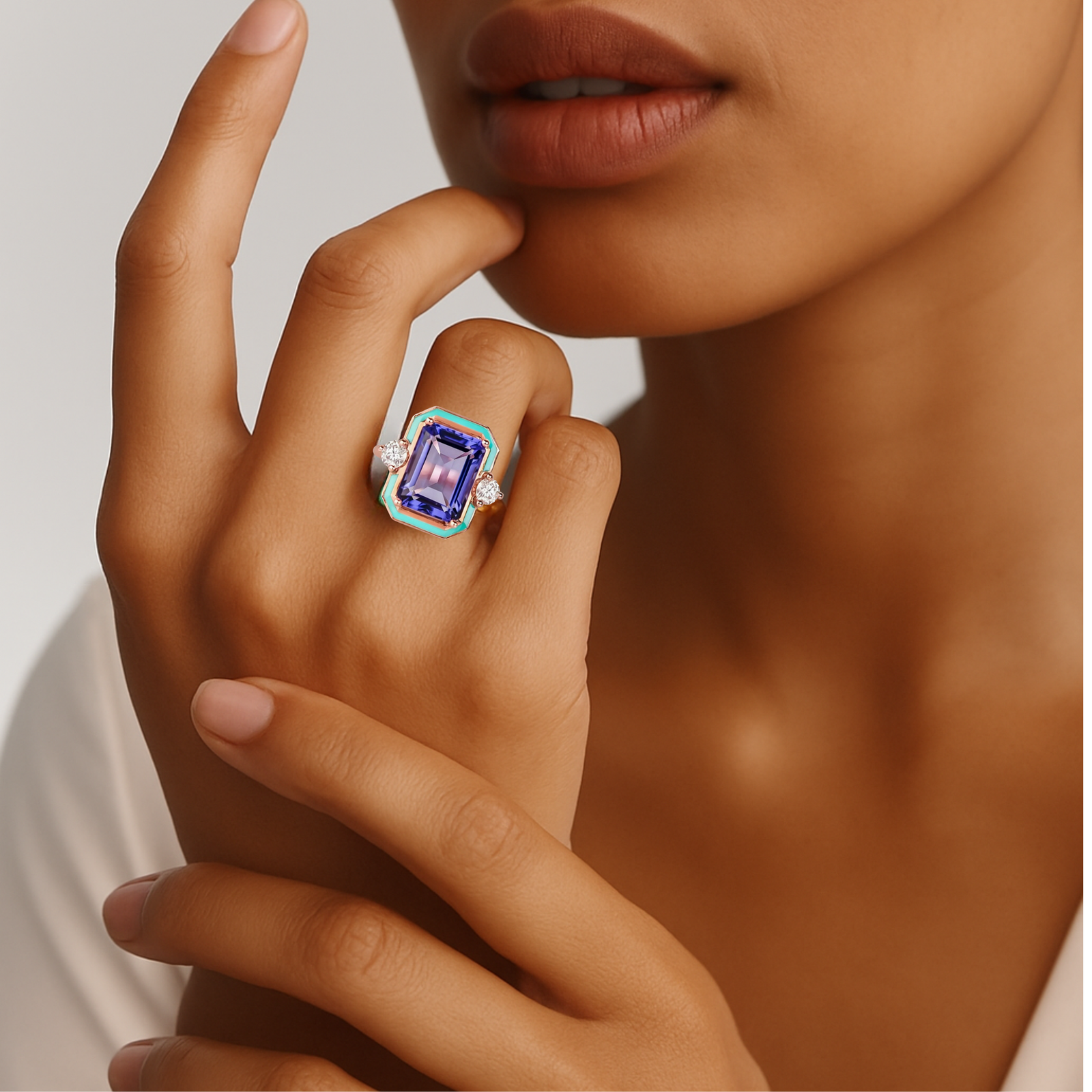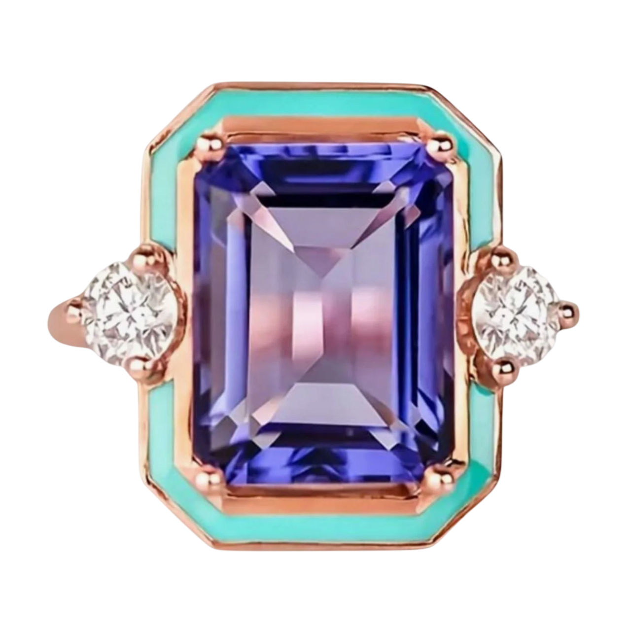 A bold violet emerald-cut crystal steals the spotlight, framed by turquoise enamel and shimmering side stones.