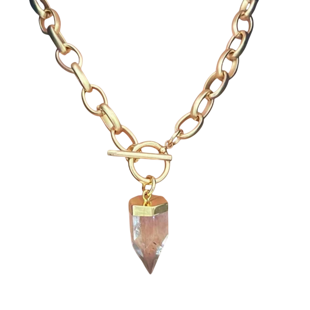 A quartz drop necklace typically refers to a necklace featuring a quartz crystal that is cut or shaped into a drop-like or teardrop shape. Quartz crystals are known for their clarity and can come in various colors such as clear quartz, rose quartz (pink), amethyst (purple), citrine (yellow), and smoky quartz (brown).