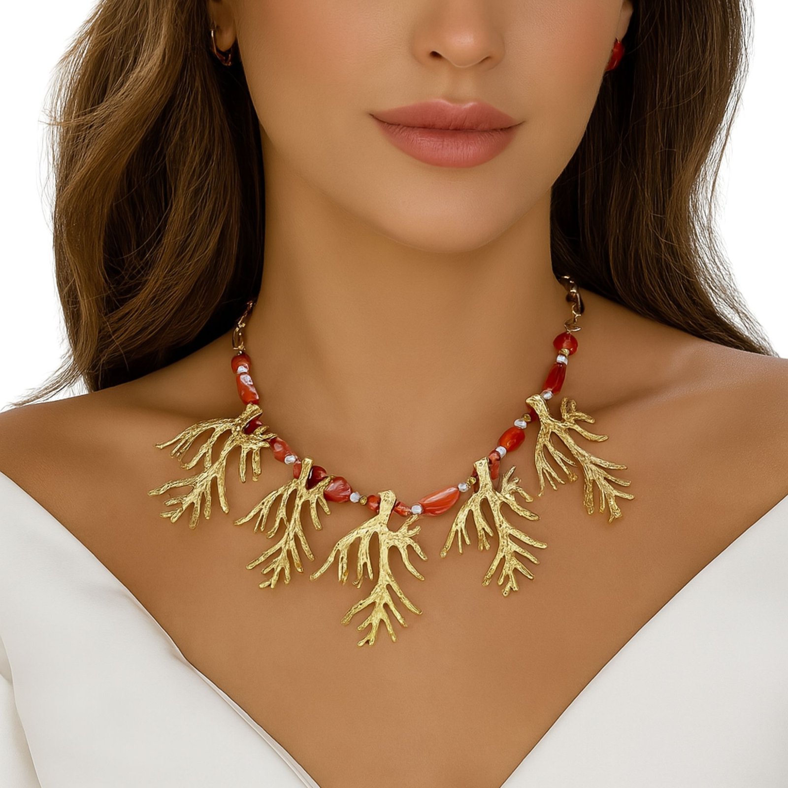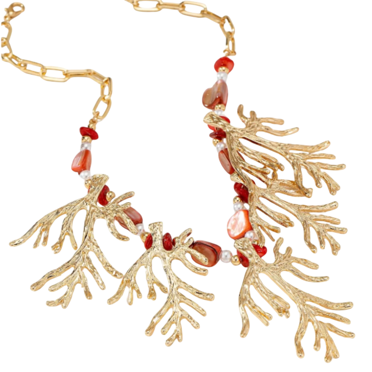 Dive into bold, oceanic glamour with this gold-tone coral reef necklace, a tribute to underwater elegance and island luxury. Crafted with intricate branch-like coral motifs in hammered metal and accented with polished red stones and faux pearls, this piece evokes a sunset stroll along a coral coast. Strung on a chunky link chain, it’s a show-stopping addition to any resort-ready look.