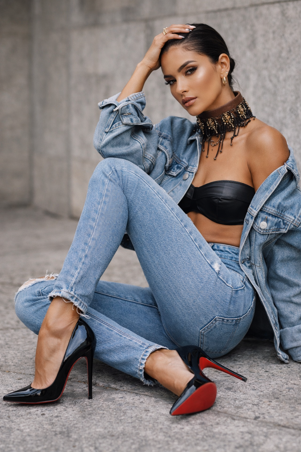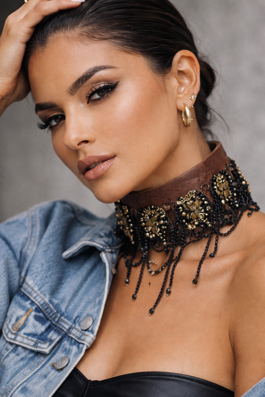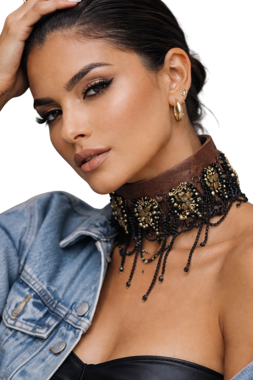 Designed to sit high at the collar, cascading accents add movement and attitude, giving the piece a sensual, modern edge. The contrast between structure and fluidity makes it endlessly versatile—effortless with denim, striking with leather, and unforgettable styled with evening looks.