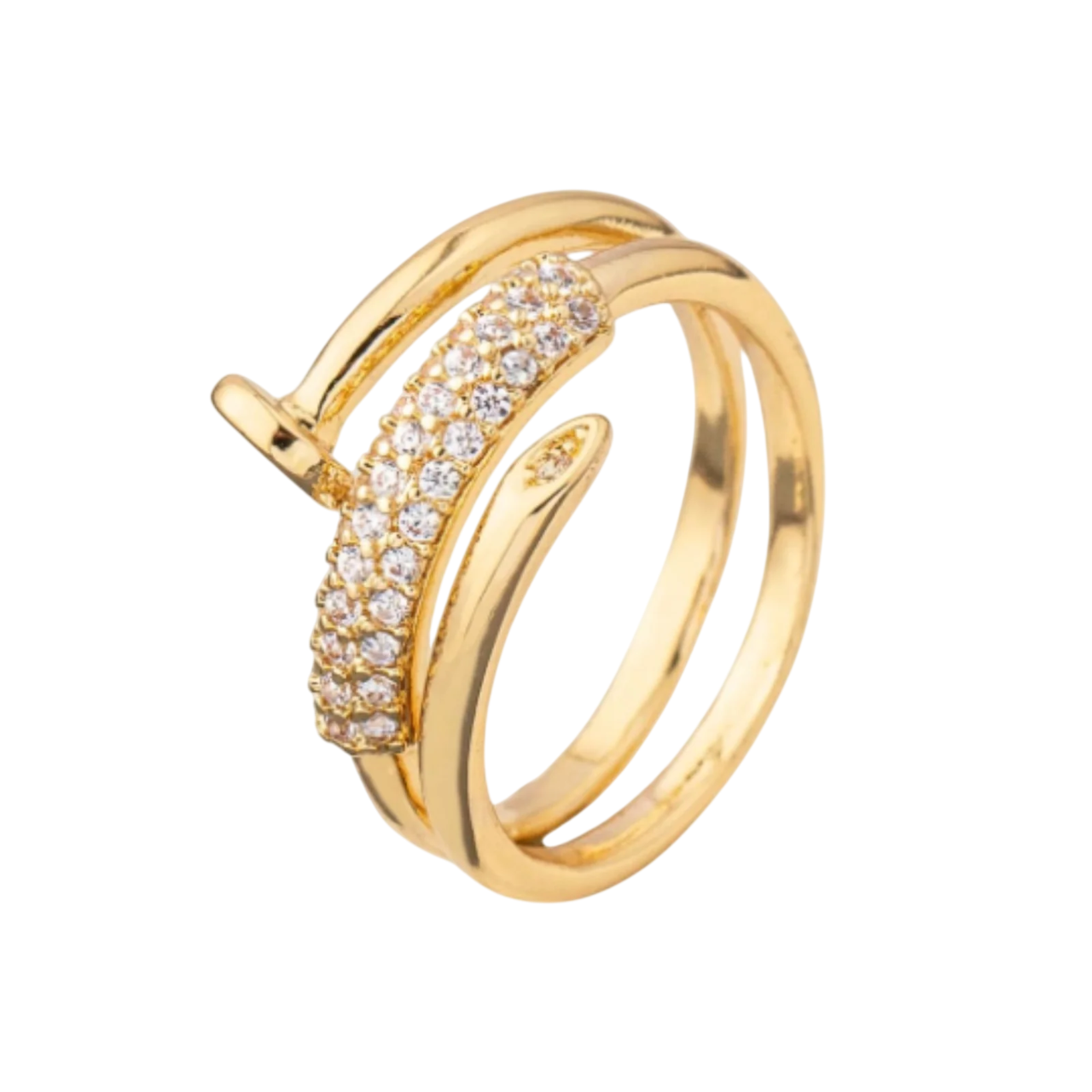 Edgy meets elegant in this unique wrap ring, combining a nail-inspired silhouette with a mix of luxe design elements. One band features shimmering pavé crystals, while marquise-shaped accents add a touch of refined detail. High-shine cubic zirconia embellishments bring brilliant sparkle, making it perfect for both everyday glam and special occasions. Lightweight and comfortable, it’s designed for versatility—wear it solo for a sleek statement or stack it for a bold, layered effect. Crafted from durable alloy with radiant gold plating. Adjustable fit for most ring sizes.